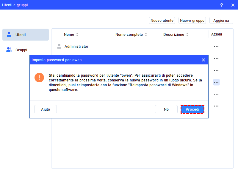 Clicca sull’opzione “Imposta Password” per cambiare la password dell’utente. Comparirà un avviso che ti ricorda di conservare la password in modo sicuro. Clicca su “Procedi” per continuare.