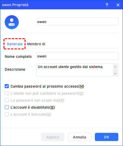 Clicca sull’opzione “Rinomina” per modificare l’utente. Nella scheda “Generale” puoi cambiare il nome completo e la descrizione dell’utente. Puoi anche selezionare o deselezionare le caselle relative alle impostazioni dell’utente. Clicca su “Applica” o “OK” per confermare le modifiche.