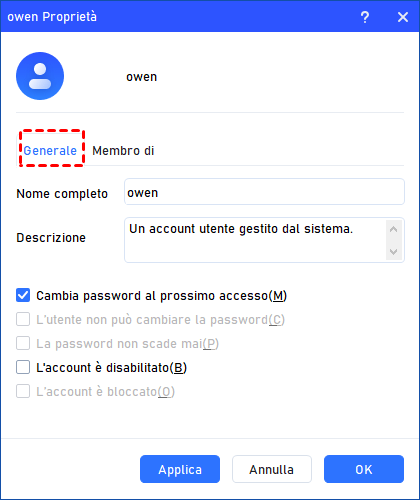 Clicca sull’opzione “Proprietà” per visualizzare e modificare le impostazioni dell’utente. Nella scheda “Generale” puoi selezionare o deselezionare le caselle relative alle impostazioni dell’utente. Clicca su “Applica” o “OK” per confermare le modifiche.