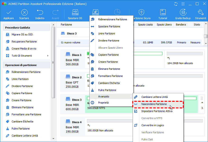 Nascondi e Scongiura Partizione - Guida di AOMEI Partition Assistant