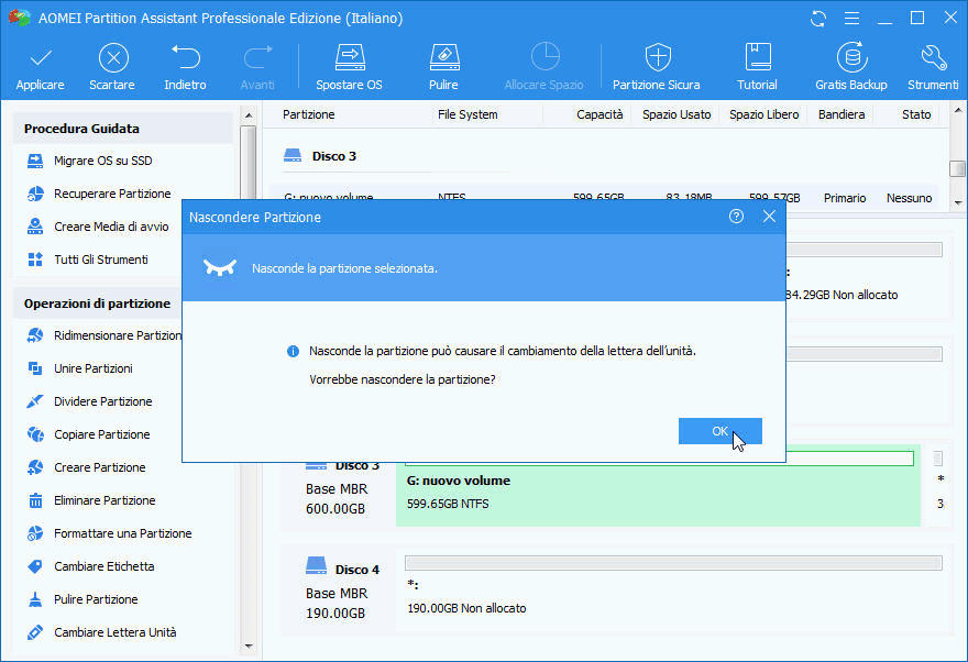 - Questa operazione di nascondere/scongiurare la partizione manterrà intatto il contenuto della partizione.