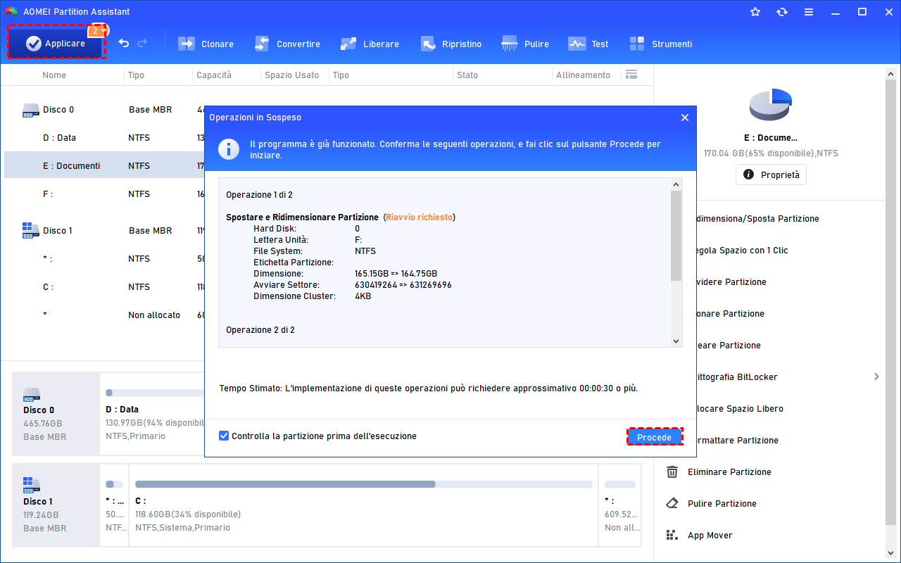 Attendi il termine dell’operazione. Una volta completata con successo, vedrai che D: è stata espansa e sia D: che F: sono state regolate correttamente.