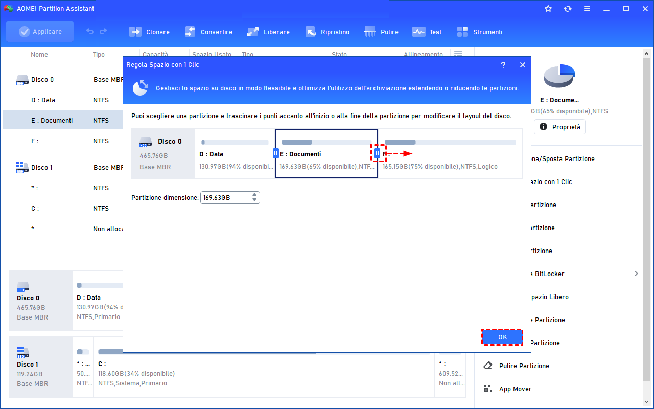 Se vuoi usare lo spazio della partizione F: per espandere D:, basta trascinare il punto vicino all’inizio della partizione F: verso indietro per ridurre F: ed espandere D: contemporaneamente. Poi clicca su OK.