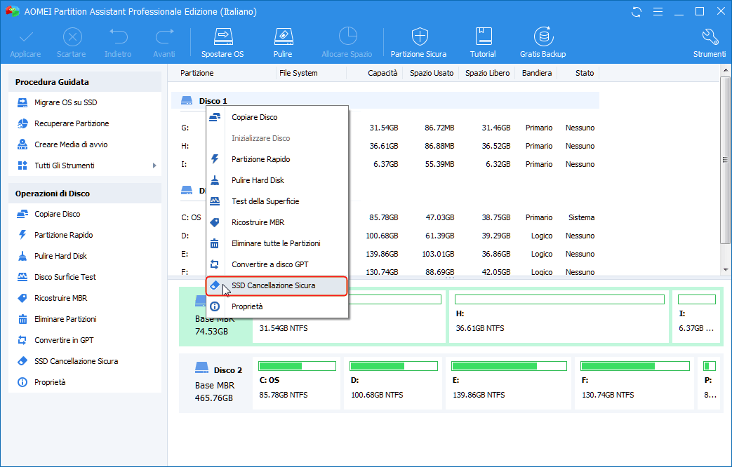 Le unità a stato solido (SSD) sono oggi molto popolari e sono ampiamente applicate ai computer in sostituzione dei tradizionali dischi rigidi. Nel caso in cui sia necessario cancellare l'SSD, puoi provare la funzionalità appena sviluppata, "Secure Erase SSD", su AOMEI Partition Assistant. Ora ti mostrerò i passaggi dettagliati per utilizzare questa funzione.