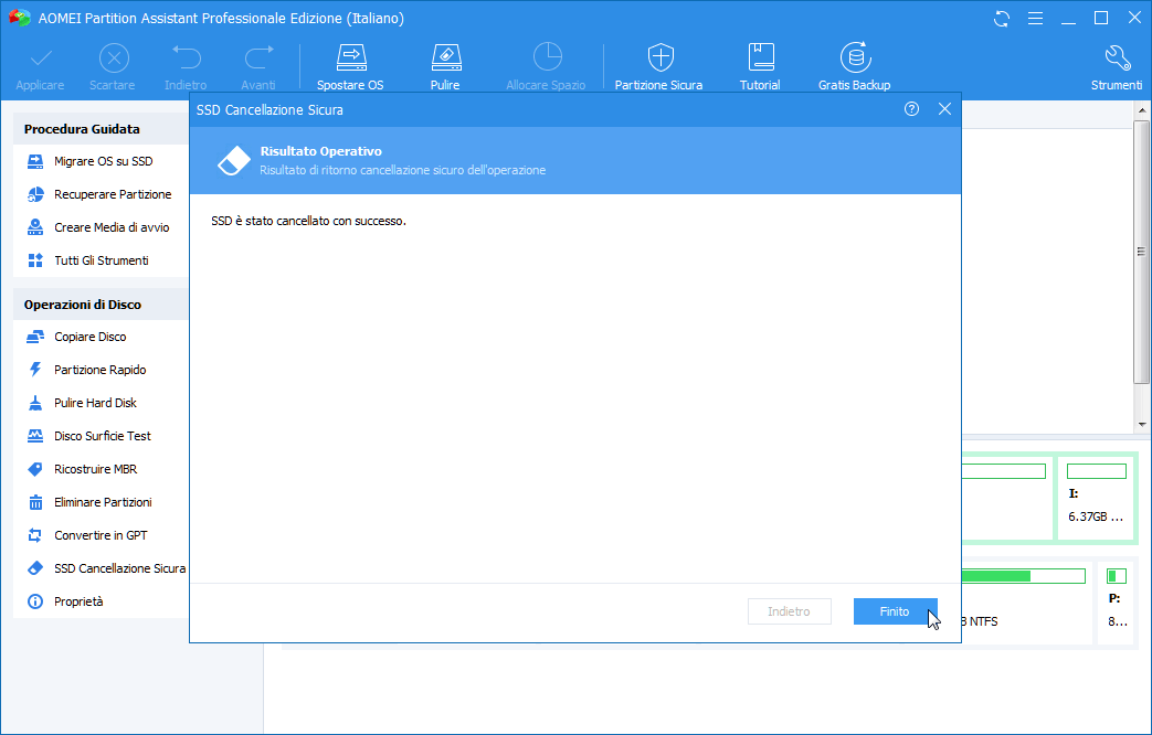 Quando il processo di cancellazione è completato, AOMEI Partition Assistant mostrerà una finestra che indica che l'SSD è stato cancellato con successo. Successivamente, otterrai uno spazio non allocato su quell'SSD. Noterai che ci sono più modi per eliminare tutte le partizioni su un disco allo scopo di ripulirlo. AOMEI Partition Assistant ha diverse strategie per diversi tipi di dischi. Fantastico, vero? Un'altra funzione di questo programma chiamata "Pulire Hard Disk" merita una prova.
