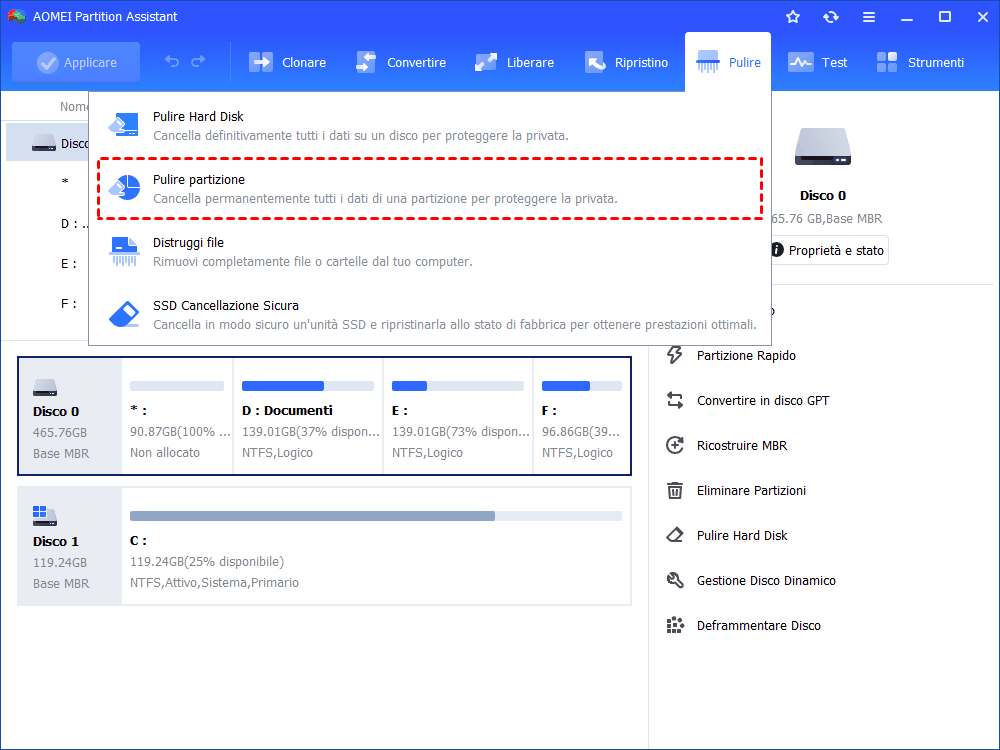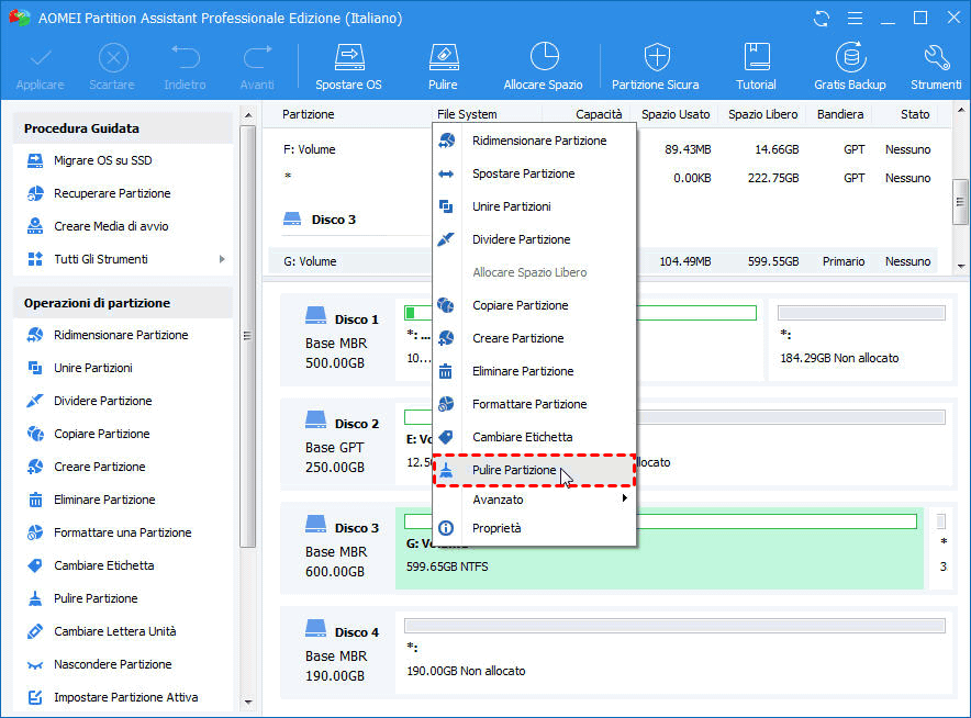 ▸ Pulire partizione lavora direttamente sul livello del sistema di file, andando oltre la sicurezza dei dati. Ha lo scopo di creare un nuovo disco per il riutilizzo senza dati vecchi. Tutti i dati saranno rimossi completamente dalla partizione, senza lasciare alcuna possibilità di recupero dei dati.