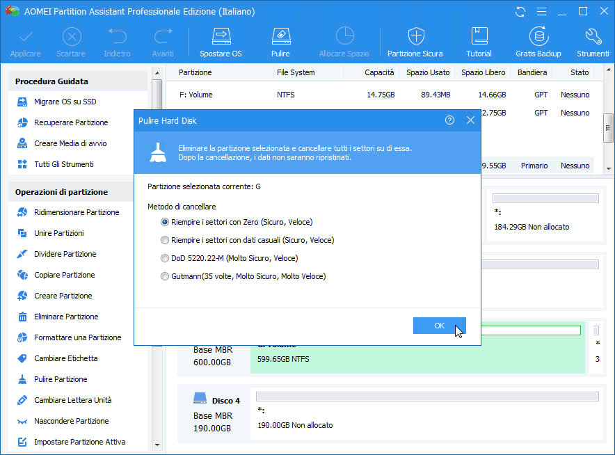 Indipendentemente dal tipo di disco su cui desideri cancellare i dati, AOMEI Partition Assistant svolge un ottimo lavoro nel cancellare i dati su hard disk e dischi SSD. Oltre alla cancellazione dei dati su questi dischi, fornisce anche la funzione "Quick Partition" per permettere all'utente di partizionare rapidamente l'hard disk o l'SSD con un solo clic.