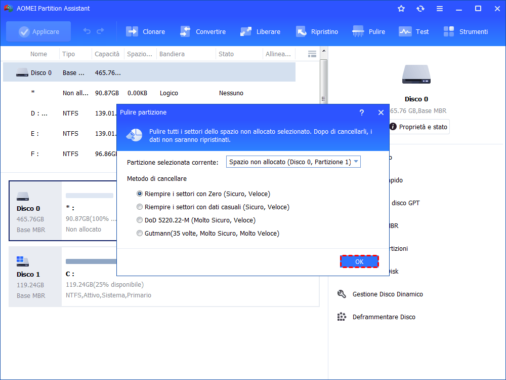 Per pulire una partizione, puoi utilizzare AOMEI Partition Assistant, che offre 4 diversi metodi di algoritmi di cancellazione per aiutare ad eliminare tutti i dati su una partizione in modo sicuro e permanente. Di seguito sono riportati i dettagli dei passaggi a cui puoi fare riferimento.