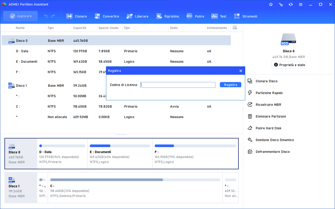 Avvia AOMEI Partition Assistant: la finestra di registrazione comparirà automaticamente e potrai inserire il tuo codice di licenza.