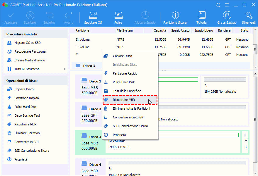 La funzione "Ricostruire MBR" aiuta a risolvere alcuni problemi, come "sistema mancante", "sistema operativo non trovato", schermo nero. Utilizza subito lo strumento di riparazione MBR - AOMEI Partition Assistant per ricostruire facilmente e in modo sicuro l'MBR.