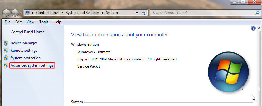 1. Right click on Computer, choose Properties. In the pop-up window, click Advanced System Settings on the left as in the picture below: