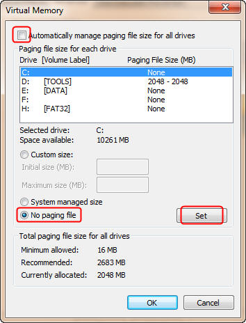 3. Click on the Change button like in the picture above. In Virtual Memory interface, Uncheck Automaticaly manage paging file size for all drivers, then choose No paging file and click on Set button like in the below picture.