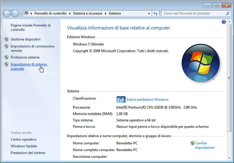 Passo 1. Fa clic "Computer" e fa clic pulsante destro del mouse "Proprietà" -> "Impostazioni di sistema avanzate".