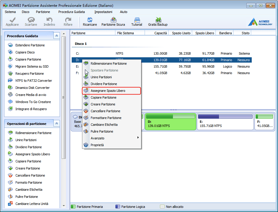 1. Puoi scaricare gratuitamente la versione demo, installare e avviare il software. Fai clic con il tasto destro del mouse sull'unità D, quindi seleziona "Allocare Spazio Libero".