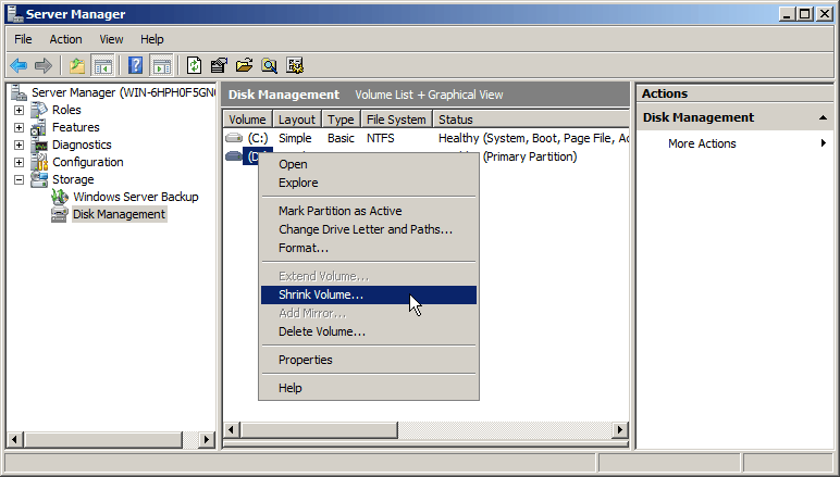 Apri Gestione disco di Server e fai clic con il tasto destro su D per selezionare "Riduci Volume" per alcuni spazi non allocati.