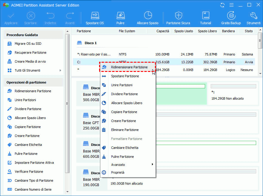 1. Scarica AOMEI Partition Assistant Server. Vai alla sua interfaccia principale e fai clic con il pulsante destro del mouse sull'unità C e seleziona "Ridimensiona/Sposta Partizione".