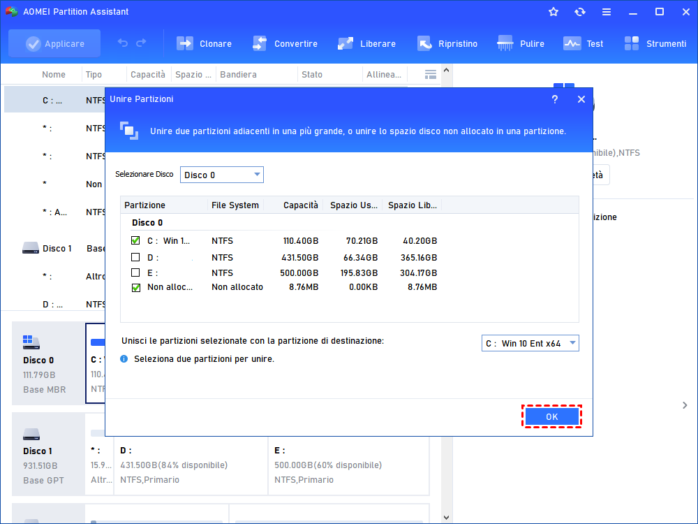 Per quanto riguarda la situazione in cui lo spazio non allocato non è adiacente alla partizione di destinazione, questo prodotto fornisce due correzioni: una è spostare la partizione tra lo spazio non allocato e la partizione da estendere sul lato destro tramite la funzione "Sposta partizione", il che rende lo spazio non allocato dietro il volume di destinazione ed estendelo con successo; mentre un altro metodo unire direttamente lo spazio non allocato non adiacente nel volume di destinazione tramite la funzione "Unire partizione". Preferiamo la seconda soluzione e ti mostriamo come farlo passo a passo.