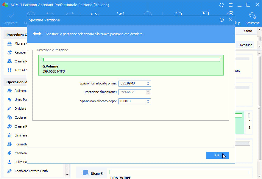 Avviso: Se sposta la partizione, lo spazio non allocato deve essere uguale o superiore alla necessità di spostare la partizione.