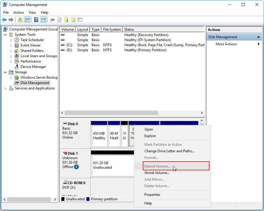 Ma quando non c'è spazio non allocato vicino alla partizione di sistema sul lato destro, Estendi Volume dovrebbe essere in grigio e impossibile utilizzare Gestione disco per unire spazio non allocato a Windows Server.