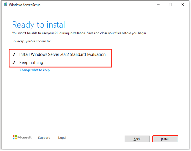 9. Nella finestra "Pronto per l'installazione" è possibile visualizzare un'anteprima dell'edizione di Windows Server 2022 scelta. Premi "Installa" per avviare l'installazione.