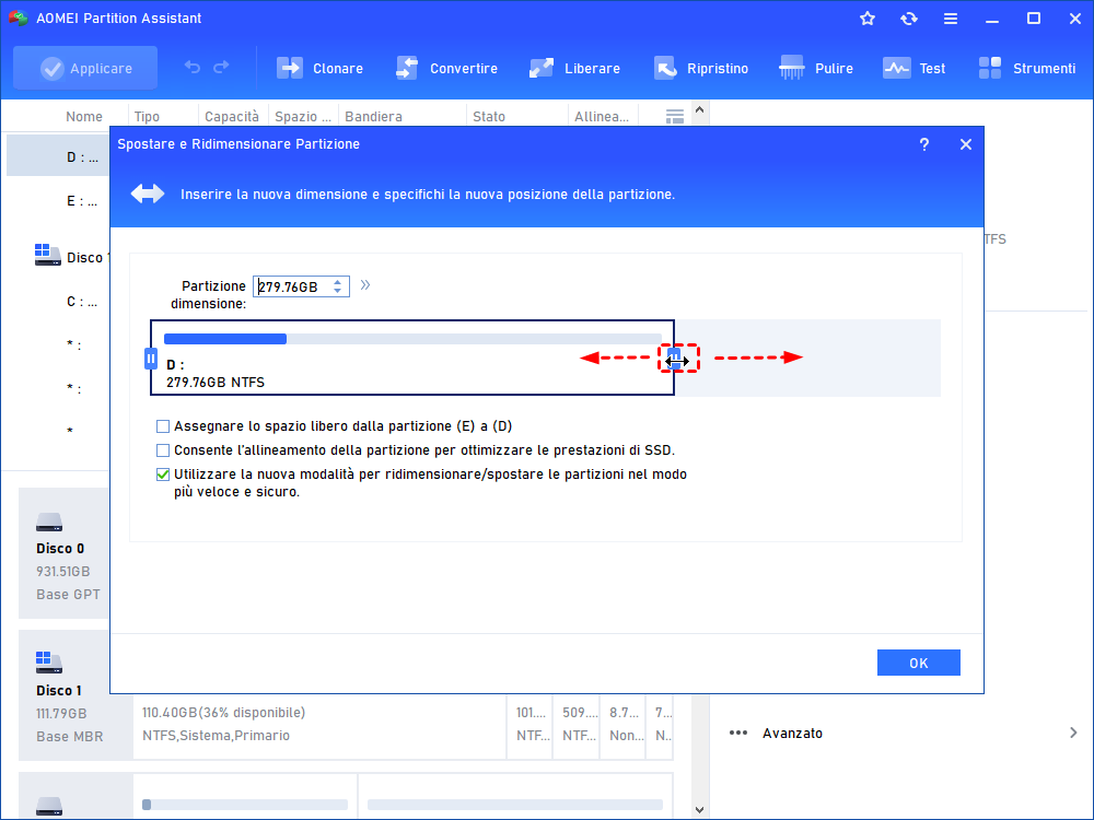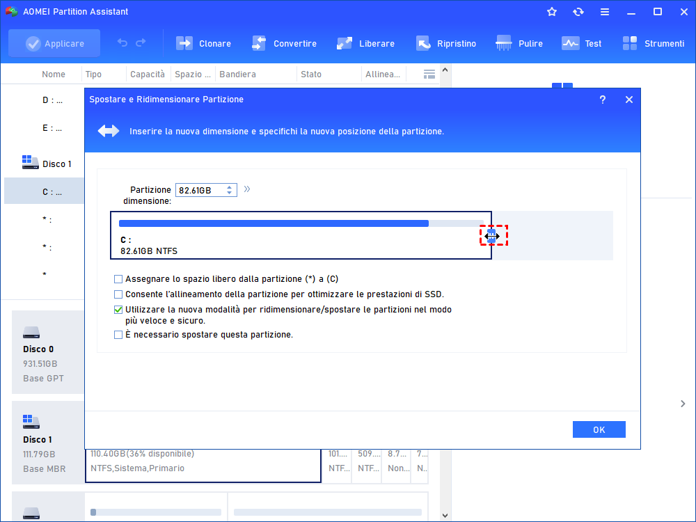 Passo 2. Ridimensionare la partizione sia dal lato "destro" che da quello "sinistro". Puoi inserire la dimensione nelle caselle. Qui trascina la barra sinistra verso destra per ottenere uno spazio non allocato dietro il disco C.