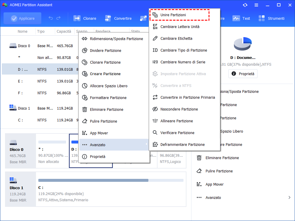 Passo 2. Poi, puoi unire il disco C: e la partizione adiacente (di solito il disco D:) e tutto lo spazio non allocato anche se non sono accanti al disco C:.