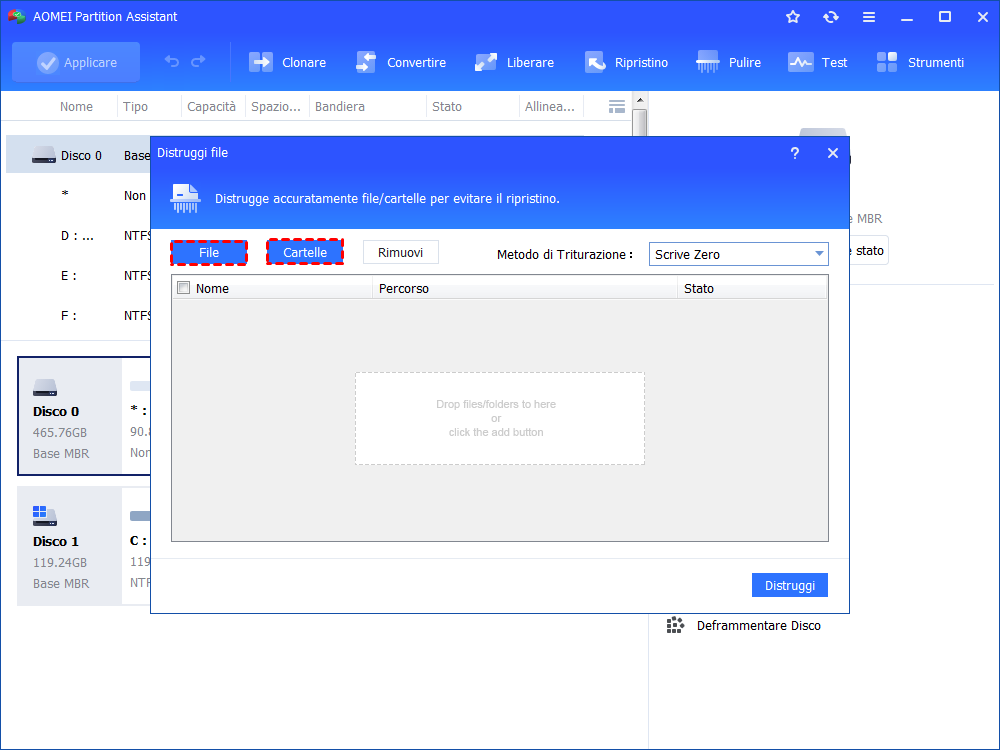I programmi di pulizia a volte riescono a liberare solo una piccola quantità di spazio. Per avere più spazio, è possibile utilizzare AOMEI Partition Assistant Standard, che offre due opzioni per questo problema. Può aiutare a eliminare alcuni file indesiderati grazie alla funzione "Distrugge File". Inoltre, la funzione "Elimina partizione" è in grado di eliminare l'intera unità di ripristino.