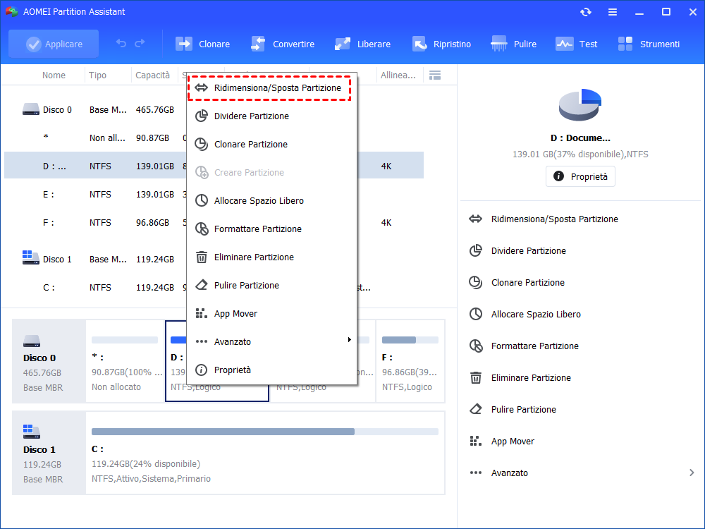 Passo 1. Installare ed eseguire il software e tutti i dischi verranno elencati. Fare clic con il pulsante destro del mouse sulla partizione che separa la partizione che verrà estesa e lo spazio non allocato (qui è disco D); Poi scegliere "Ridimensiona/Sposta Partizione".