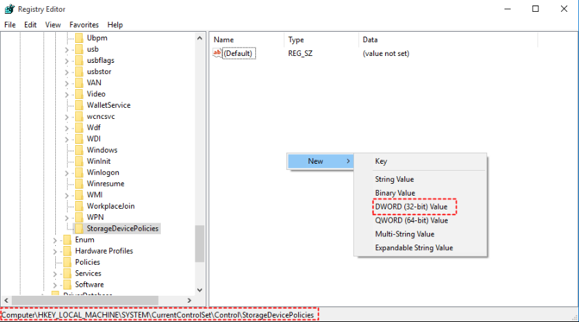 4. Selezionare la chiave appena creata, e fare clic con il pulsante destro del mouse sullo spazio bianco nel riquadro a destra. Selezionare New, e fare clic su DWORD (32-bit) Value. Assegna un nuovo nome DWORD WriteProtect.