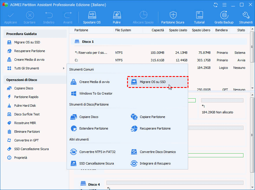 Con AOMEI Partition Assistant Professional, è possibile migrare Windows 10 su SSD senza reinstallare il sistema operativo. Inoltre, oltre a spostare il SO solo su SSD, AOMEI Partition Assistant fornisce anche "Copia disco" che può clonare l'intero disco rigido su SSD in Windows 10.