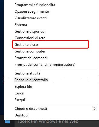 Passo 1: Per partizionare il disco rigido di Windows 10, iniziamo ad aprire lo strumento di gestione disco in Windows 10. Il modo più semplice è fare clic con il pulsante destro del mouse su Start Menu e selezionare "Gestione Disco".