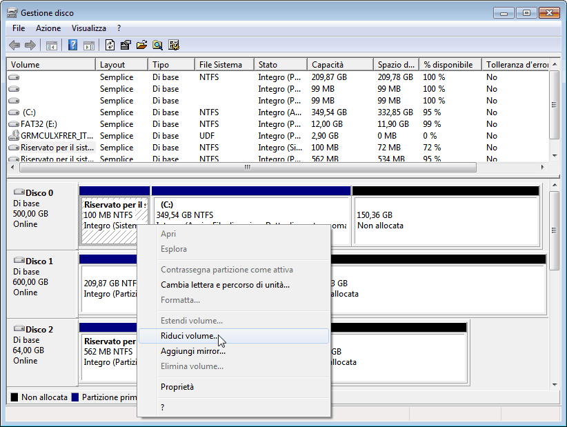 Passo 2: Seleziona il disco rigido da partizionare. Fare clic con il pulsante destro del mouse su una partizione (qui è 0: disco) e seleziona "Riduci Volume".