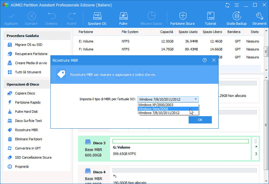 ▶ “Ricostruire MBR” non provocherebbe alcun tipo di perdita di dati. Tuttavia, la ricostruzione di MBR in modo improprio potrebbe causare la disabilitazione del computer. Quindi, è meglio imparare più conoscenze rilevanti prima di eseguire l'operazione di Ricostruire MBR. ▶ Se si riscontra una perdita di dati dopo l'operazione, è possibile utilizzare la funzione di recupero dati per recuperare i dati importanti persi.