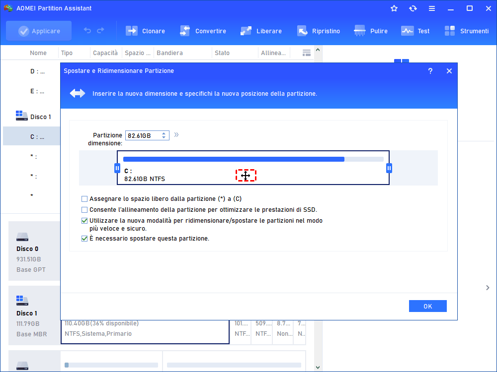 Per spostare una partizione senza perdita di dati, è necessario un software di terze parti AOMEI Partition Assistant.