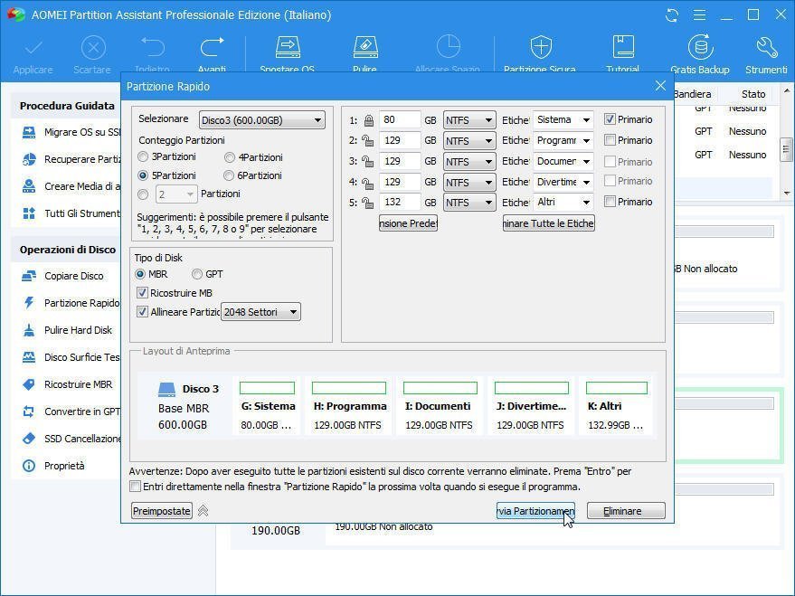 Quindi, come creare più partizioni per la vostra macchina? Naturalmente, è possibile ricorrere all'utilità gratuita di Windows Gestione disco per ridurre un volume, creare spazio non allocato e utilizzare lo spazio non allocato per creare un nuovo volume. Tuttavia, c'è anche un modo più semplice utilizzando AOMEI Partition Assistant Professional. Invece di creare le partizioni una per una, con questo potente software, sarai in grado di creare diverse partizioni in una volta con la funzione "Partizione Rapida".