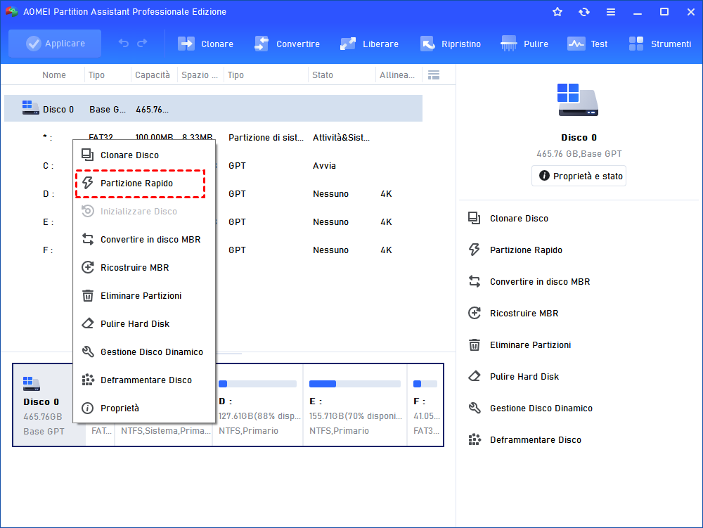 Passo 2. Nella dinestra principale, seleziona e fa clic sul disco che vuoi partizionare. Seleziona "Partizione Rapido".
