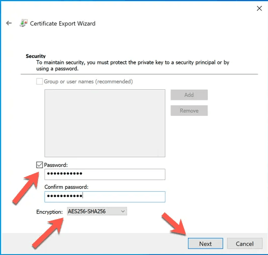 Passaggio 8. Selezionare la casella Password e inserire due volte la password desiderata per accedere al file criptato. Fare clic su "Avanti".