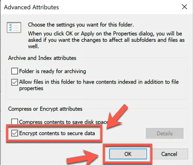 Passaggio 3. Nella finestra Attributi avanzati, selezionare "Crittografa i contenuti per proteggere i dati" e quindi fare clic su "OK".