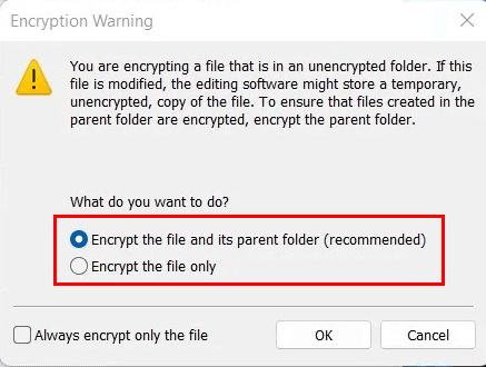 Passaggio 5. Quando compare l'avviso di crittografia, selezionare "Crittografa il file e la cartella padre (consigliato)" o "Crittografa solo il file" e fare clic su "OK".