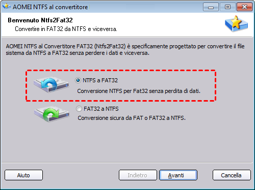 Passo 2. Scegli "NTFS in FAT32" e clicca su "Avanti", poi segui le istruzioni per completare i passaggi successivi.