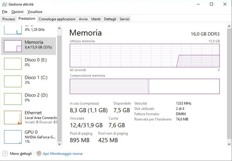 Prima di procedere, è necessario aprire Gestione attività e fare clic su "Prestazioni". Il sistema visualizzerà il tipo di memoria e il numero di slot utilizzati. Quindi acquistate una memoria RAM compatibile e installala sul computer.
