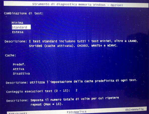 Passo 3. Diagnostica memoria Windows viene eseguito automaticamente dopo il riavvio del computer ed esegue automaticamente un test di memoria standard. Se si desidera eseguire meno o più test, premere "F1" per accedere alle impostazioni avanzate all’avvio, impostare Combinazione di Test come Minima, Standard o Estesa, poi premere F10 per applicare le impostazioni desiderate e riprendere il test.