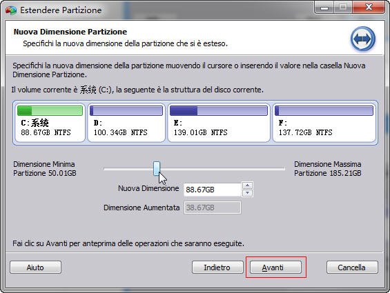 Passo 4. Spostare il barra a destra per decidere quanto spazio libero si desidera aggiungere dalla partizione D alla partizione C, e poi clic "Avanti". Nel prossimo passo, clic "Procede" per eseguire l'operazione.