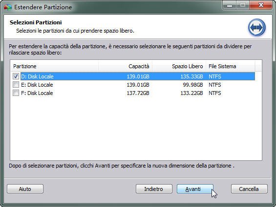 Passo 3. Selezionare una partizione in cui si desidera scaricare lo spazio libero e quindi fare clic su "Avanti".