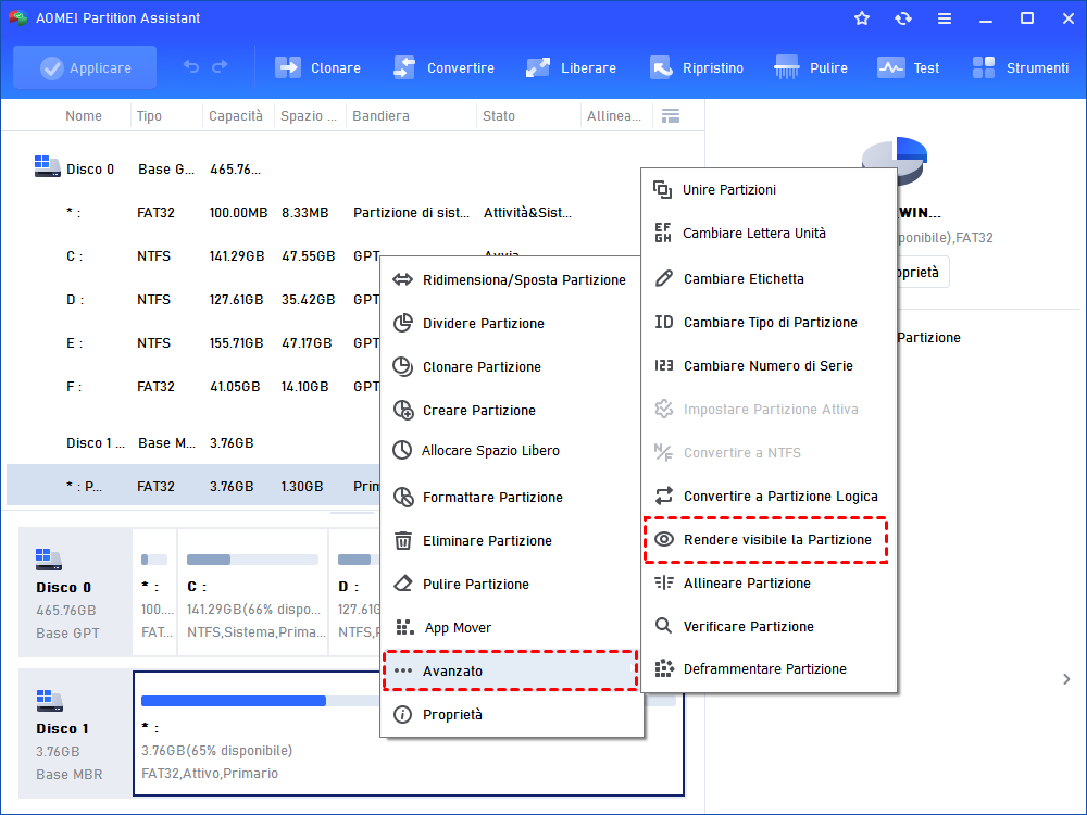 Passo 1. Nell'interfaccia utente principale, clicca con il tasto destro del mouse sulla partizione nascosta che devi far apparire in Esplora file e andate su "Avanzato">"Rendere visibile la partizione".