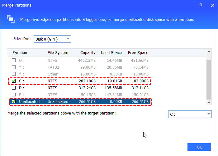 Right-click system partition(C:), select “Merge Partitions”, in the pop-up window tick the “C: partition” and the “unallocated space”. Click “OK”.
