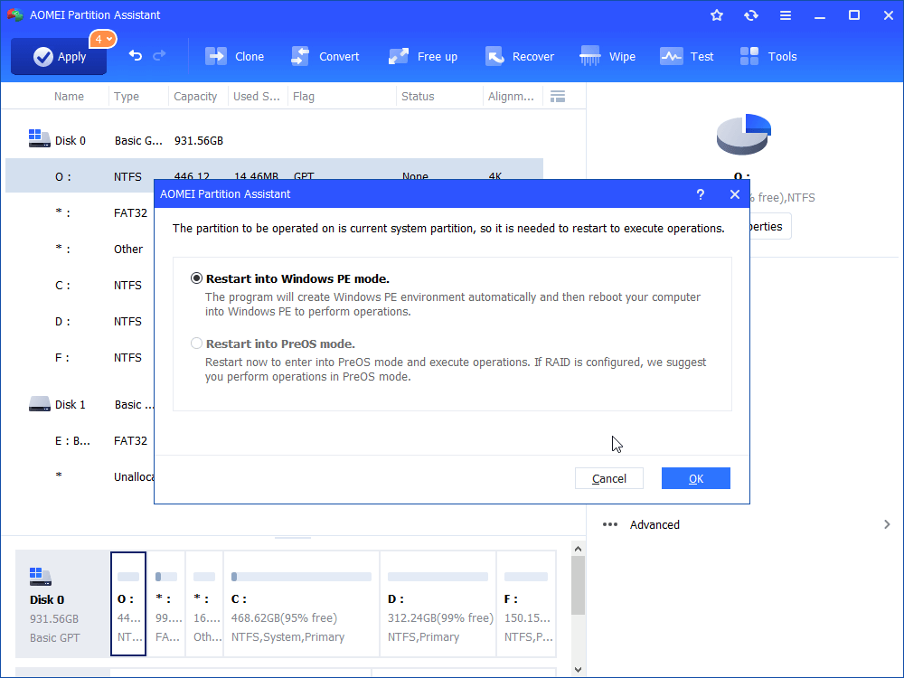 Note: if the target partition is FAT32 or could not be locked in “EPW” or it contains the paging file, the program would ask for rebooting and the operation will be completed under the Restart Mode when you click “OK”.