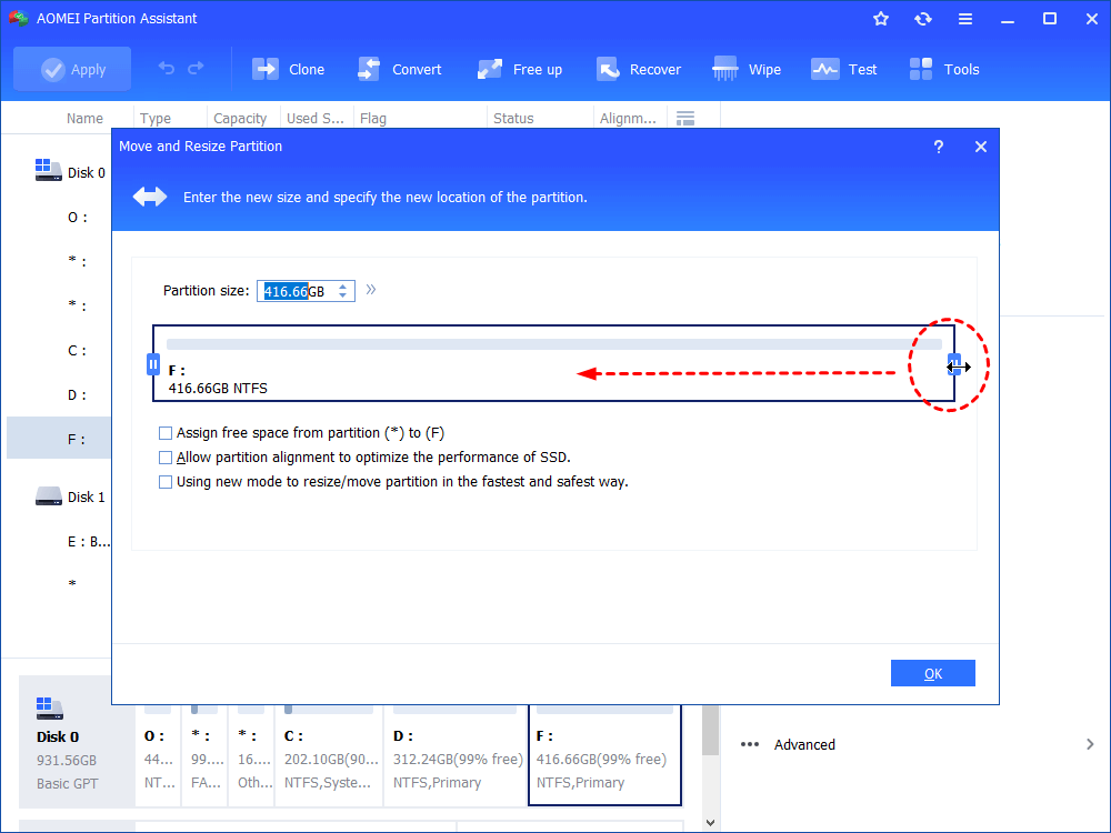 Back to the PA main console, right-click the partition that you want to release free space (here we select partition F: as an example), select “Resize/Move Partition”, in the pop-up window drag right handle of the partition leftwards to release the free space. Then click “OK”.
