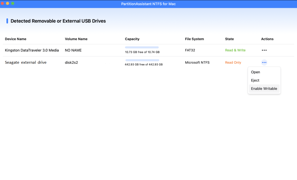 Step 1. Run Partition Assistant NTFS for Mac and connect your Seagate NTFS hard drive. The connected, removable, and Seagate drives will be mounted and listed.