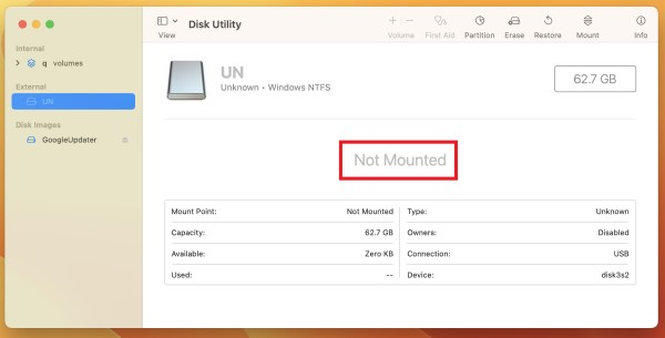 | Drive is visible in Disk Utility but remains unmounted | macOS recognizes the device at the hardware level but cannot parse the NTFS file system without appropriate drivers or software |
